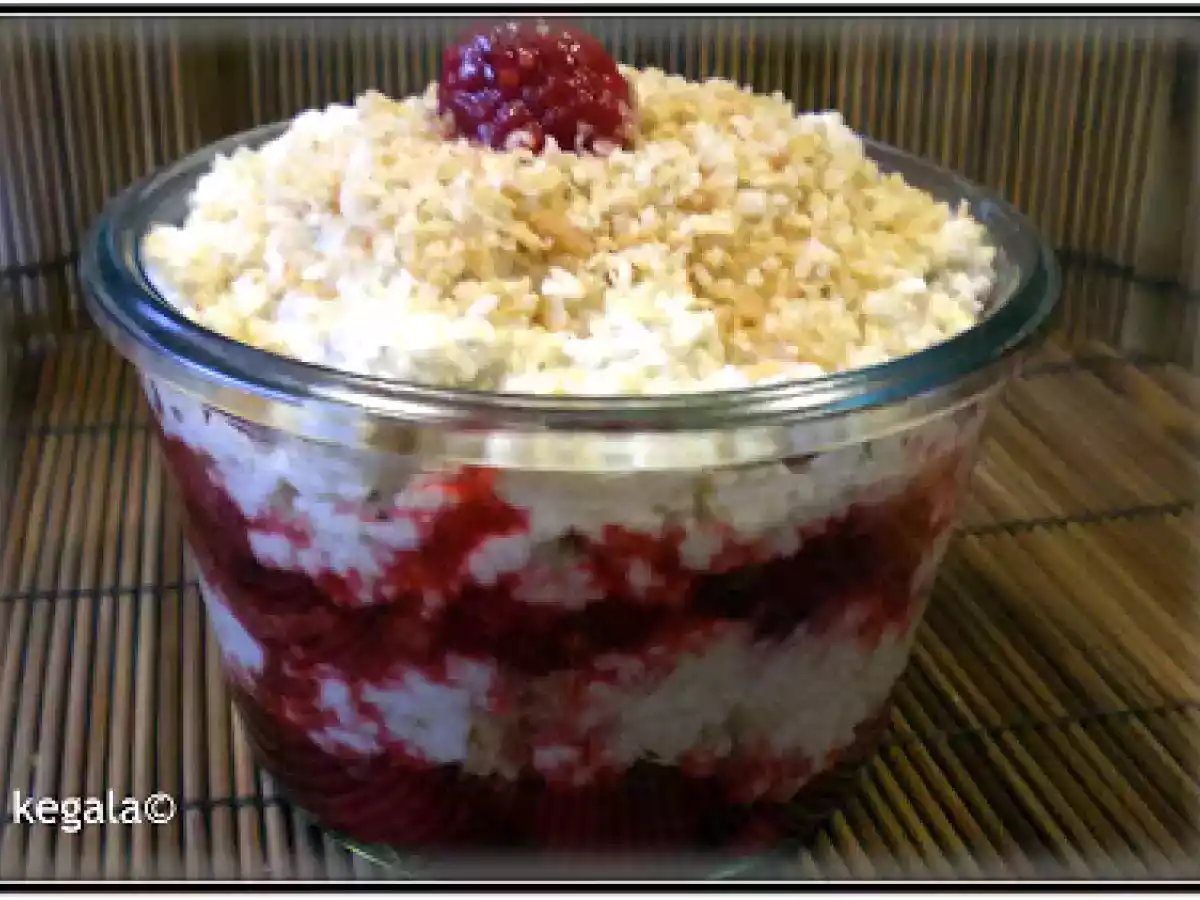 - Beeren mit Joghurt Amaranth geschichtet in Gläsern bestreichen und mit gerösteten Kokosflocken.