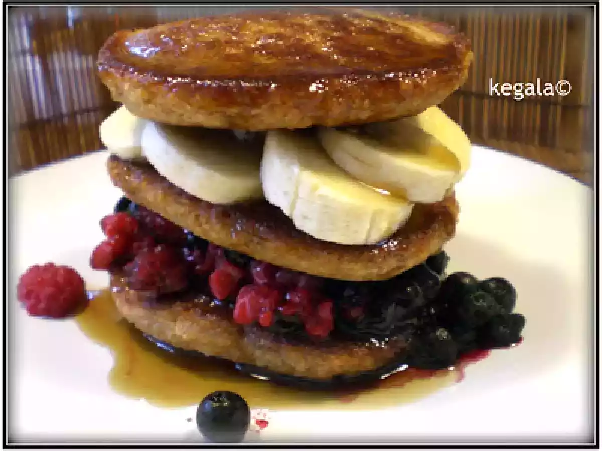 - Pfannkuchen mit Himbeeren und Bananen Schichten oder mit Früchten, wie gewünscht.