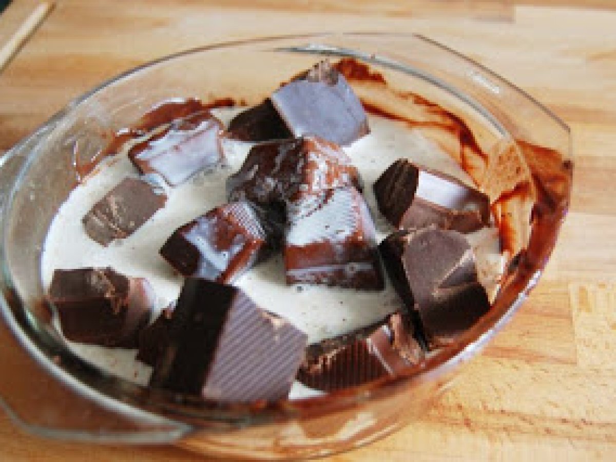 - Gießen Sie die Creme über der Schokolade, kurz ziehen lassen.