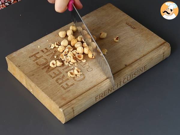 Legen Sie die Haselnüsse auf ein mit Backpapier ausgelegtes Backblech. Backen Sie sie 10 Minuten lang in einem auf 200 °C vorgeheizten Ofen. Lassen Sie sie abkühlen. Die Haut von den Haselnüssen abziehen, indem man sie unter den Händen rollt.