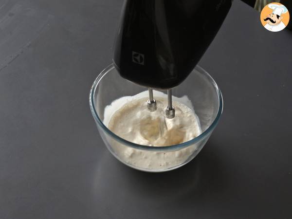 Schlagen Sie alles zu einer kompakten Schlagsahne. In einen Spritzbeutel umfüllen.