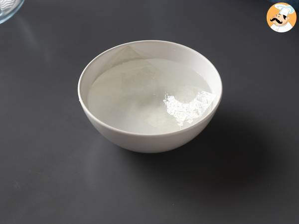 Die Gelatineblätter 5-10 Minuten lang in einer Schüssel mit kaltem Wasser einweichen.