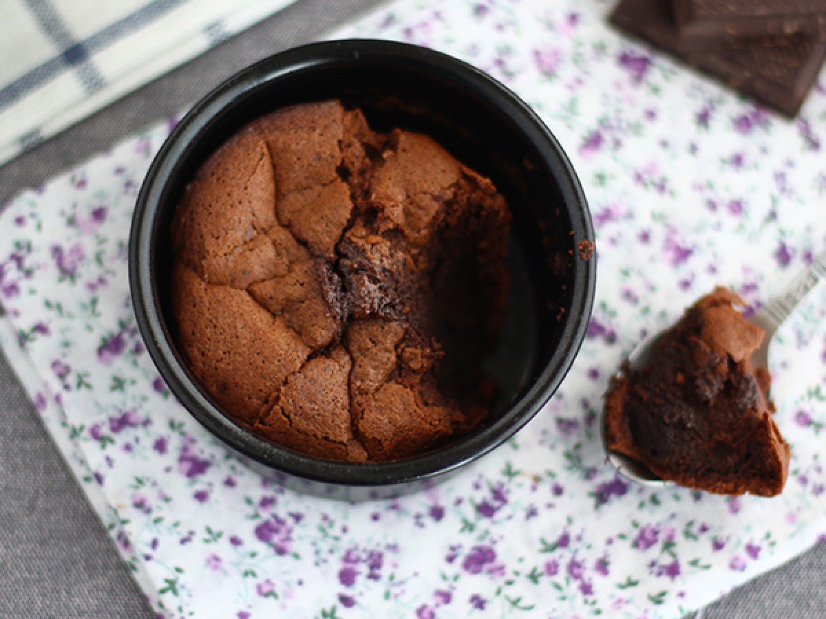 Die Mischung in die zuvor gebutterten Auflaufformen geben und 10 Minuten bei 200 °C backen. Backen Sie nur 6 bis 7 Minuten, um einen fließenden Kern zu erhalten.