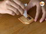 Schneiden Sie mit einem Messer Schlitze in den Brownie und schieben Sie die dekorierten Kekse hinein.