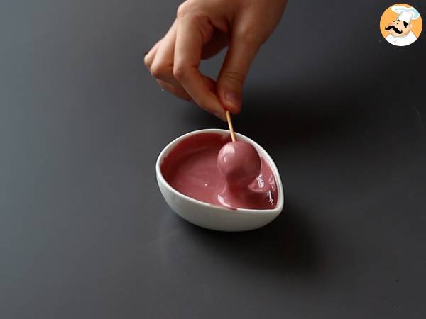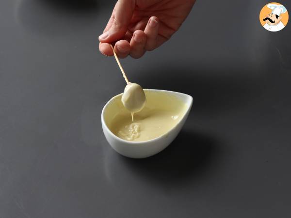 Eine Himbeere mit einem Holzspieß anstechen und in die weiße Schokolade tauchen.