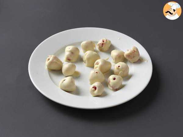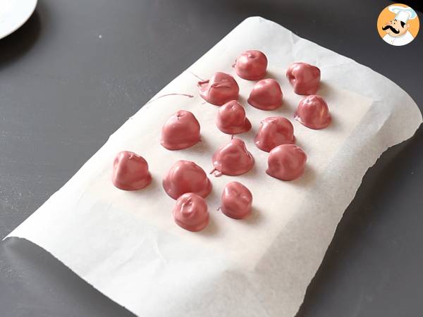 Die überzogene Himbeere auf einen Teller oder ein Blatt Backpapier legen und den Vorgang mit den anderen Himbeeren wiederholen. Für mindestens 10 Minuten in den Gefrierschrank legen.