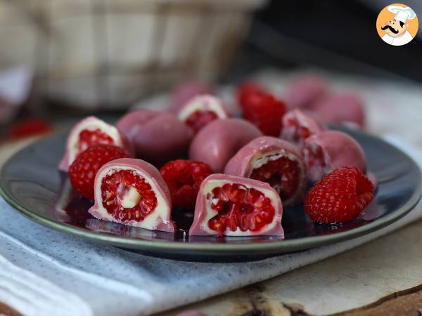 Häppchen mit himbeeren, weißer schokolade und ruby-schokolade nach franui-art