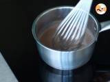 Den Rest der Mandelmilch erhitzen und die verdünnte Maisstärke hinzufügen. Haselnusspüree und Kakao dazugeben.