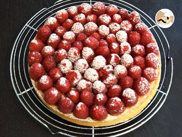- Reinigen Sie die Himbeeren und legen Sie sie schön auf die Mandelcreme. Streuen Sie mit Puderzucker und schon ist Ihr Himbeerkuchen fertig!