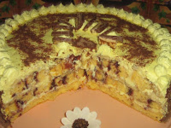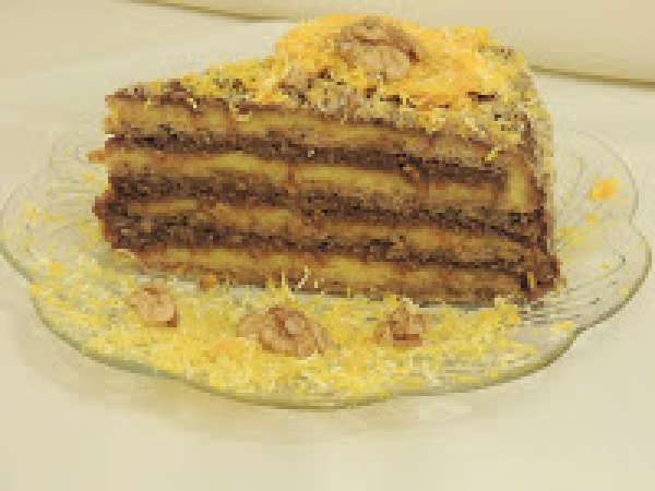 Runde befeuchten Brot mit Orangensaft. - Sortieren Sie die Bananenscheiben in den Ringen (auf jedem Stück Banane drücken Sie einen Tropfen Zitronensaft) und der Rest der Füllung wird über den ganzen Kuchen zu verbreiten.