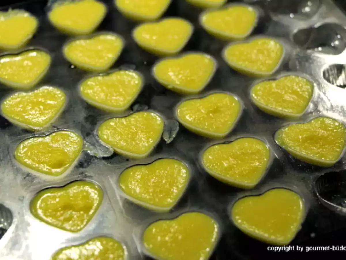 - Für die Füllung Mix 50g Mango Fruchtfleisch mit einem Teelöffel Honig und 50 g geschmolzene weiße Schokolade. Füllen Sie die Creme in einer Halbkugelform und frieren für ca. 1 Stunde.