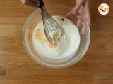 Mit dem Schneebesen gut verrühren, dann die zuvor leicht verquirlten Eier hinzufügen und ein wenig (nicht zu viel) schlagen, um eine gleichmäßige Masse zu erhalten.