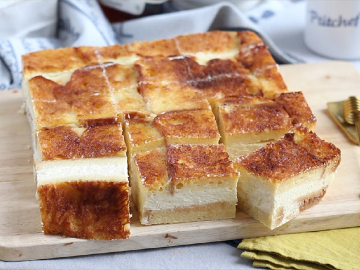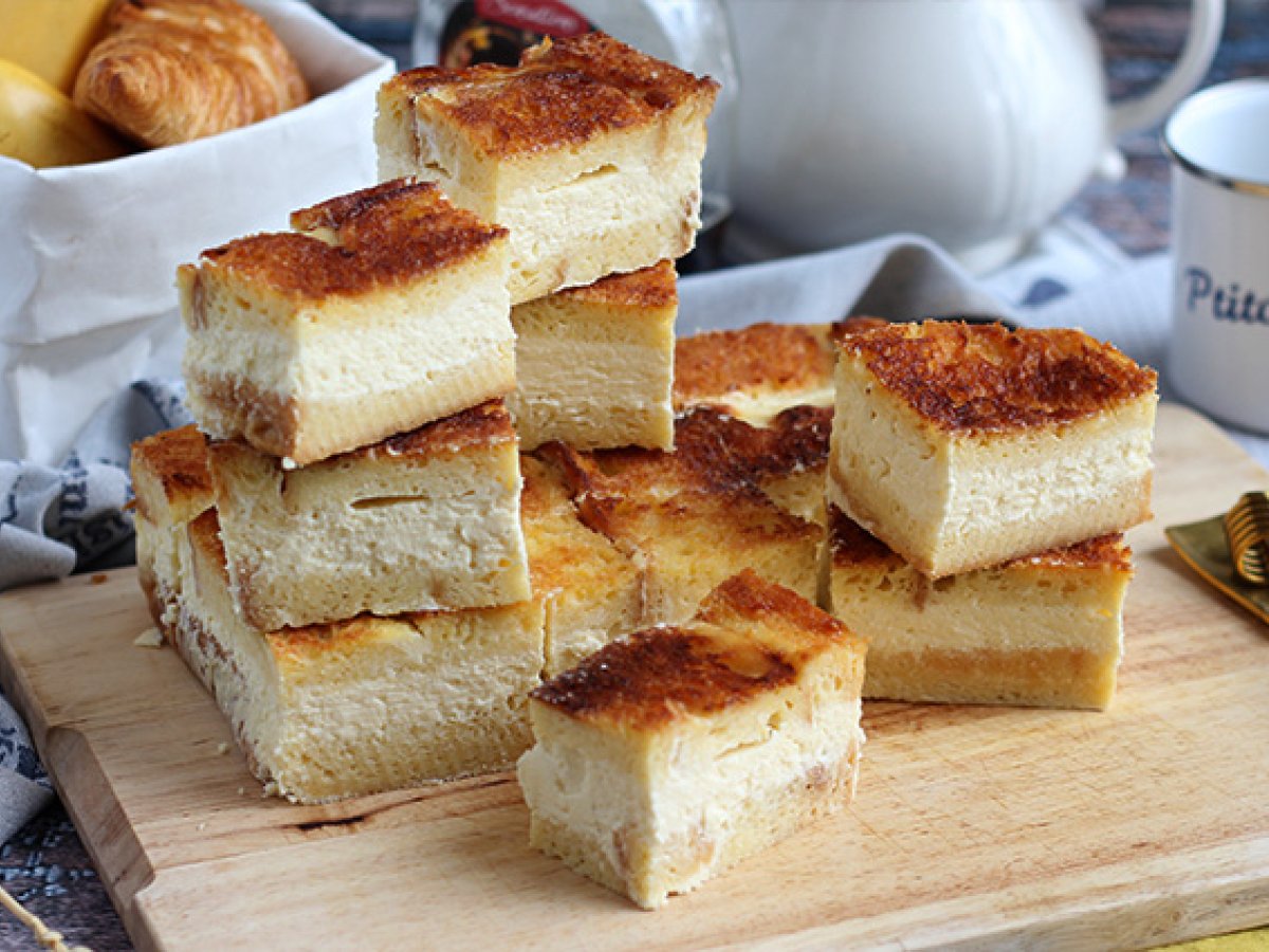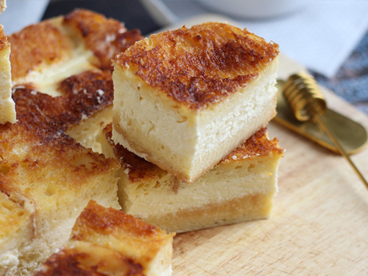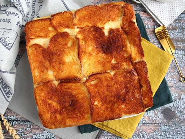 Wie wär's, wenn wir French Toast und American Cheesecake miteinander kombinieren - und schon haben wir ein Wettbewerbsrezept! :D Schneiden Sie ihn in Riegel und servieren Sie ihn mit Sirup als i-Tüpfelchen! Sie werden von der Konsistenz und dem Geschmack begeistert sein. Jetzt sind Sie dran, legen Sie los!