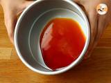Um Karamell herzustellen, schmelzen Sie 75 g Zucker mit etwas Wasser in einem Topf, bis sich Karamell bildet, und gießen Sie es sofort in die Form.