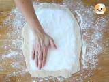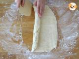 Rollen Sie Ihren Teig auf einer bemehlten Arbeitsfläche aus, sodass er eine rechteckige Form erhält. Die Rahmbutter darauf verteilen und rundherum einen Rand von 2 cm frei lassen. Stellen Sie sicher, dass Sie eine gleichmäßige Schicht haben.