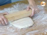 Wenn Sie den Teig aus dem Kühlschrank nehmen, klopfen Sie mit dem Nudelholz darauf, um ihn ein wenig zu verteilen und dabei eine gleichmäßige Butterschicht zu erhalten. Anschließend mit den üblichen Rollbewegungen wieder zu einem Rechteck ausrollen.