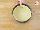 Legen Sie den sandigen Teig in die Scharnierform (Falten Sie die Kanten, wenn es zu hoch ist). Mit einer Gabel durchlöchern und bei 15 Minuten bei 180°C vorbacken.