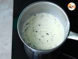 Schlagen Sie das Eigelb mit dem Zucker, bis die Mischung weiß wird. Die Sahne, die Milch und das gesüßte Kondensmilch in einen Topf geben. Fügen Sie die Samen der Vanilleschale hinzu. Wenn die Mischung kocht, fügen Sie es zu dem gesüßten Eigelb.