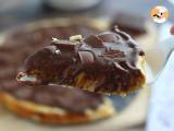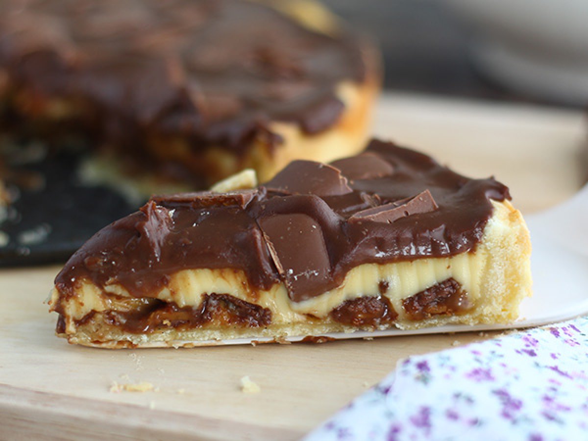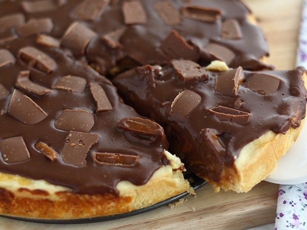 Dann gießen Sie die Mischung in den Kuchenboden. Schneiden Sie 100 g Daims grob und fügen Sie sie in die Sahne.