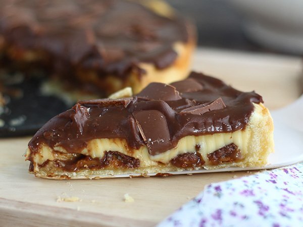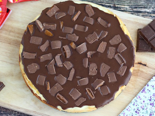 Die Sahne zum Kochen bringen und dann noch kochend über die Milchschokoladenstücke gießen. Mischen, bis es glatt homogen ist. Auf den kalten Kuchen gießen. Legen Sie auf 100 g Daims in Stücke geschnitten. Abkühlen lassen.
