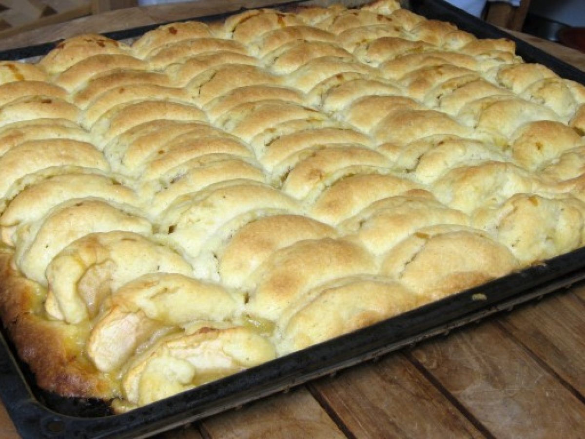 - Apfel greift zwischen zwei Schichten aus Teig.