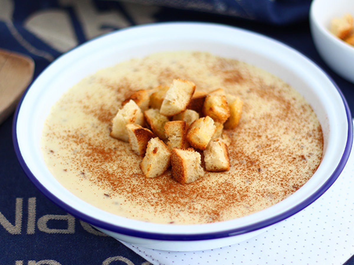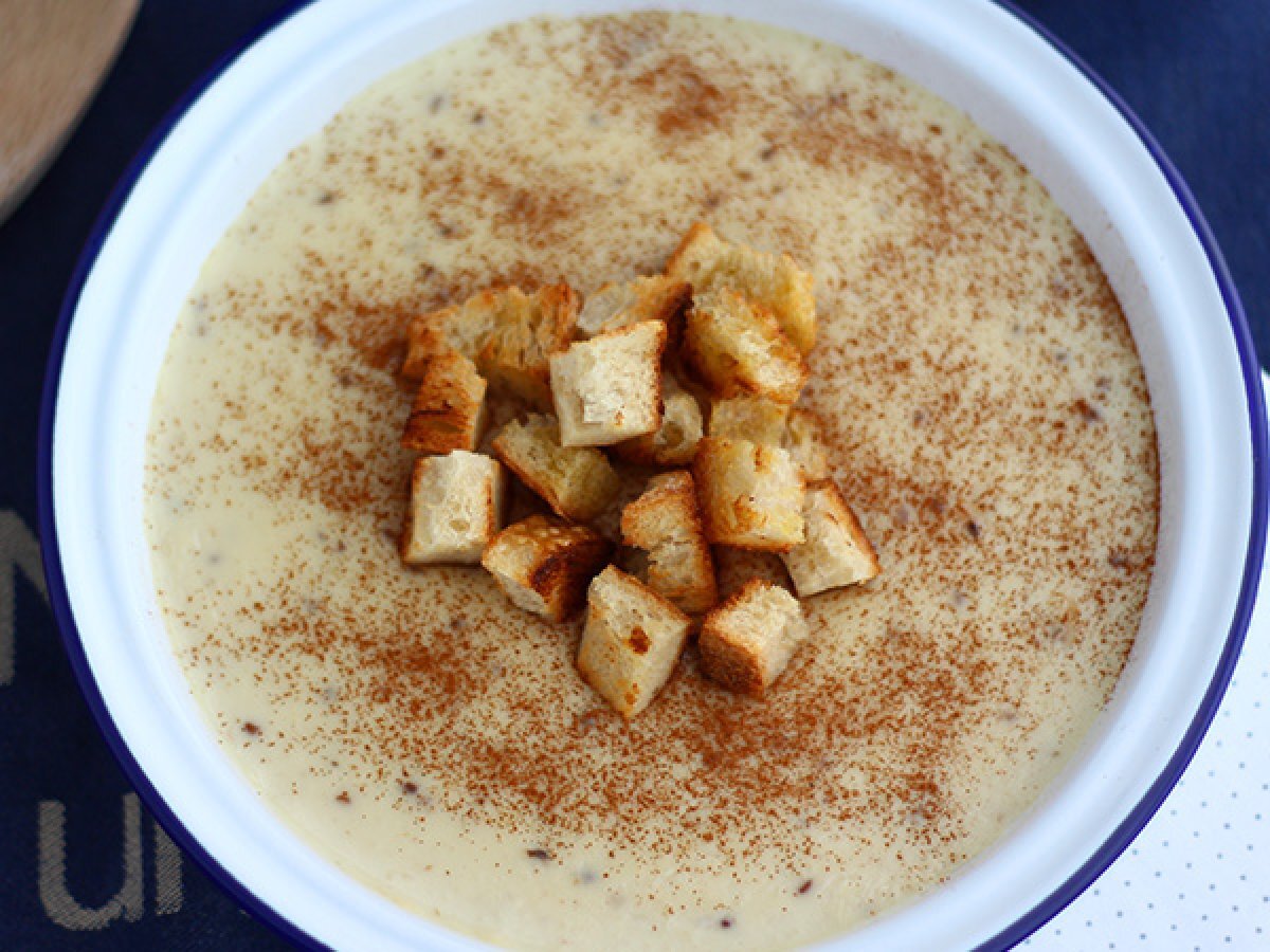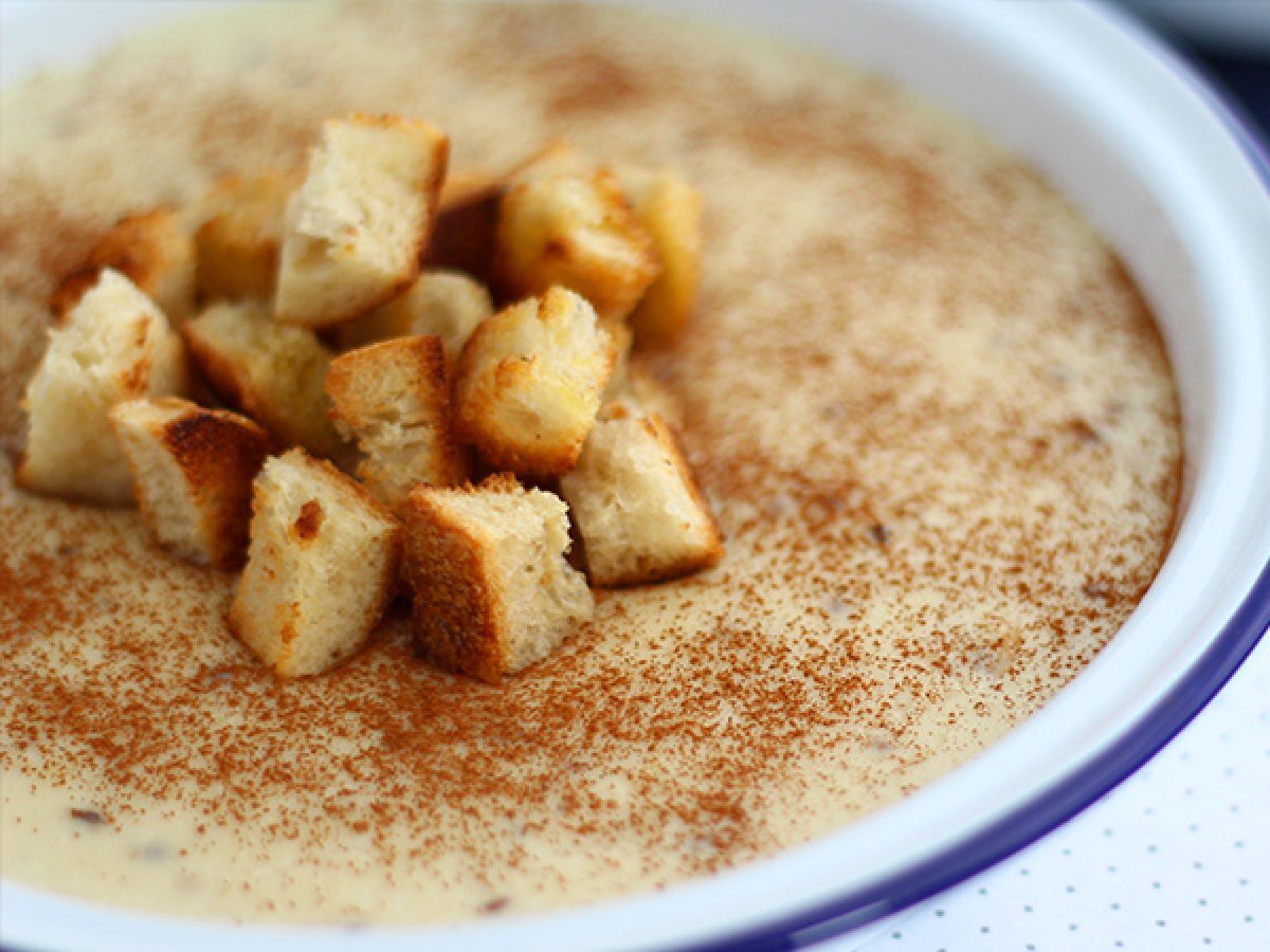 Die Croûtons auf der Creme anrichten, nachdem sie mit gemahlenem Zimt bestreut wurde.