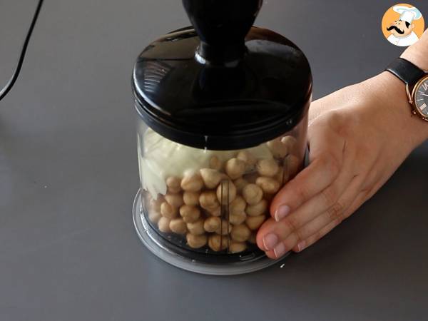 Die gerösteten, geschälten Haselnüsse (siehe Beobachtungen) mit der geschmolzenen weißen Schokolade zu einer homogenen Creme mixen.