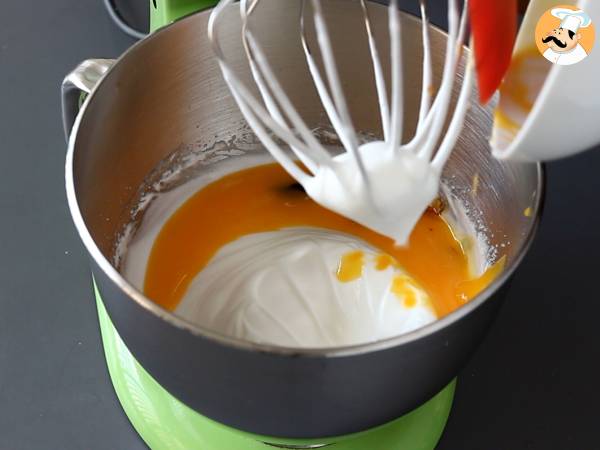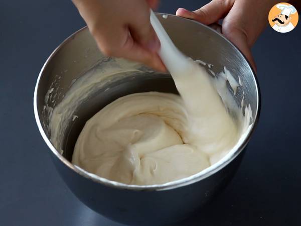 Eigelb und Vanilleextrakt hinzufügen und gut verquirlen, um eine luftige Masse zu erhalten.