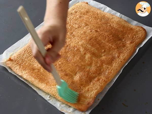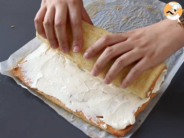 Rollen Sie den Biskuit vorsichtig auf und übertragen Sie ihn auf die Servierplatte.