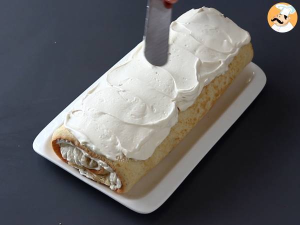 Verteilen Sie die Kinder Bueno-Creme auf der gesamten Oberfläche des Biskuits. Mit der Vanillecreme bedecken. Achtung: Für den oberen Teil der Roulade aufheben.