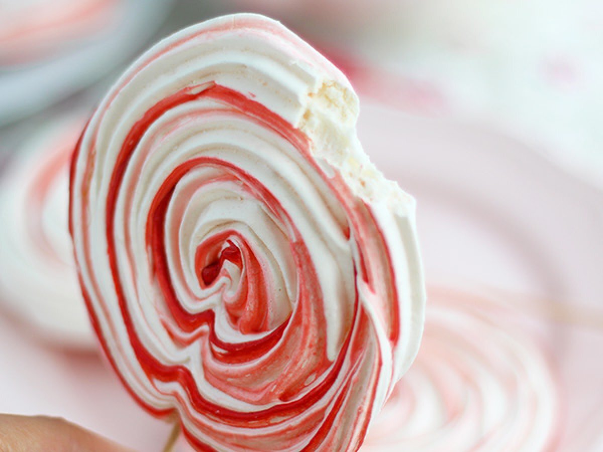 Füllen Sie den Beutel mit dem Baiser und formen Sie auf einem Backblech Lollis. In jeden Lolli einen Schaschlikspieß stecken.