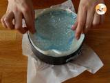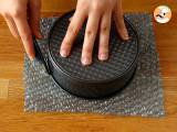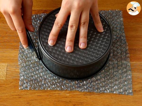 Gießen Sie diese Mischung in die Form auf dem Boden. Gut verteilen, dann die Luftpolsterfolie auf den Käsekuchen legen (Blasenseite auf der Creme) und mindestens 4 Stunden, am besten über Nacht, in den Kühlschrank stellen.