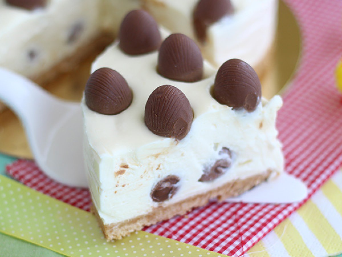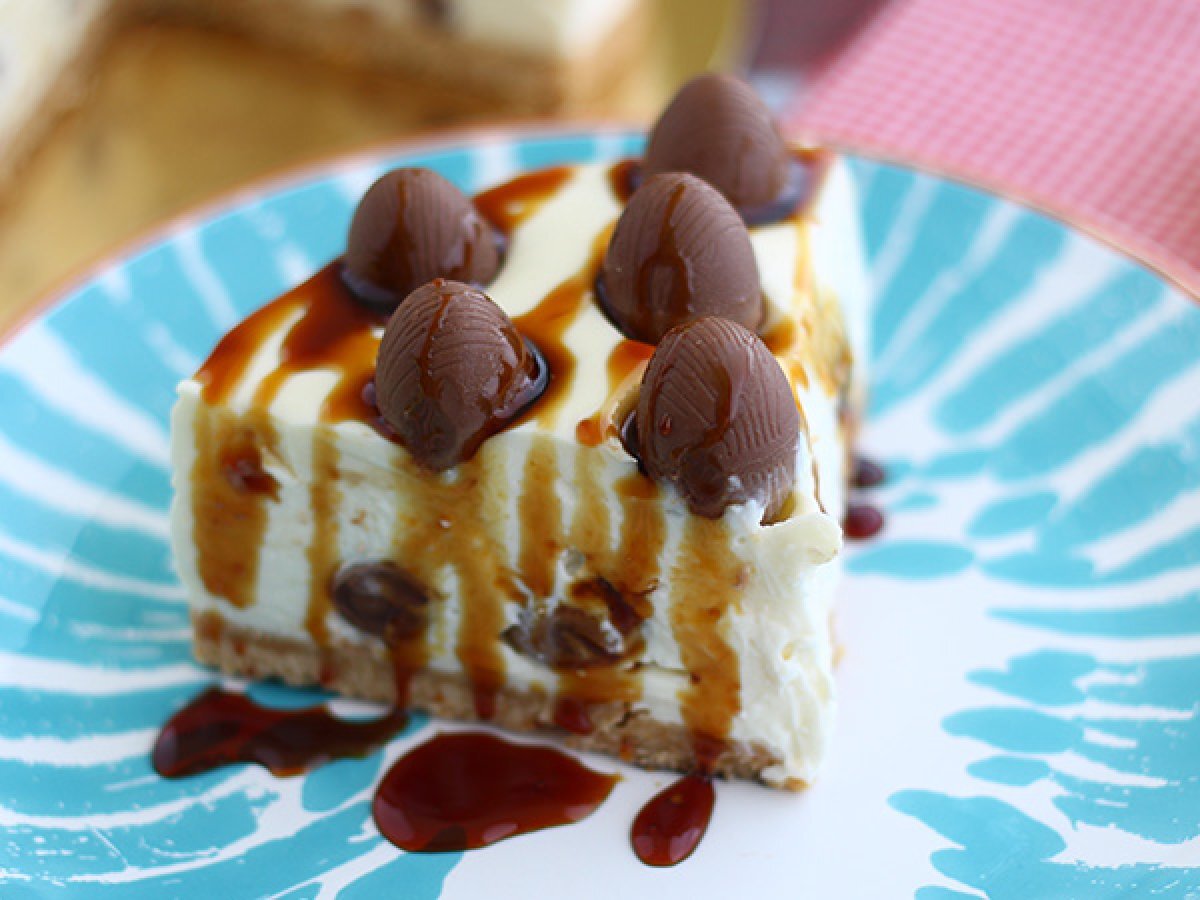 Verwenden Sie die restlichen Schokoladeneier, um die Oberseite des Käsekuchens zu verzieren, indem Sie sie leicht eindrücken. Stellen Sie den Kuchen für mindestens 4 Stunden in den Kühlschrank.
