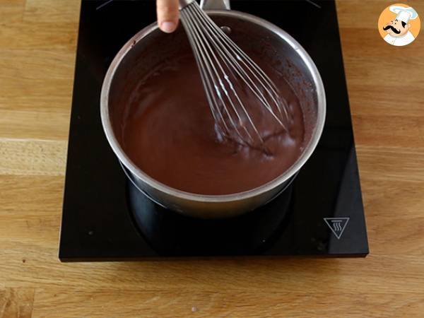 Maizena, Kakao und Zucker in einem Topf ohne Hitze mischen. Nach und nach die Milch hinzugeben und gut verrühren.
