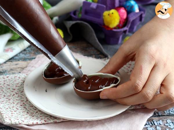 Trennen Sie die Schokoladeneier in zwei Hälften und verteilen Sie die Creme in den Schalen.