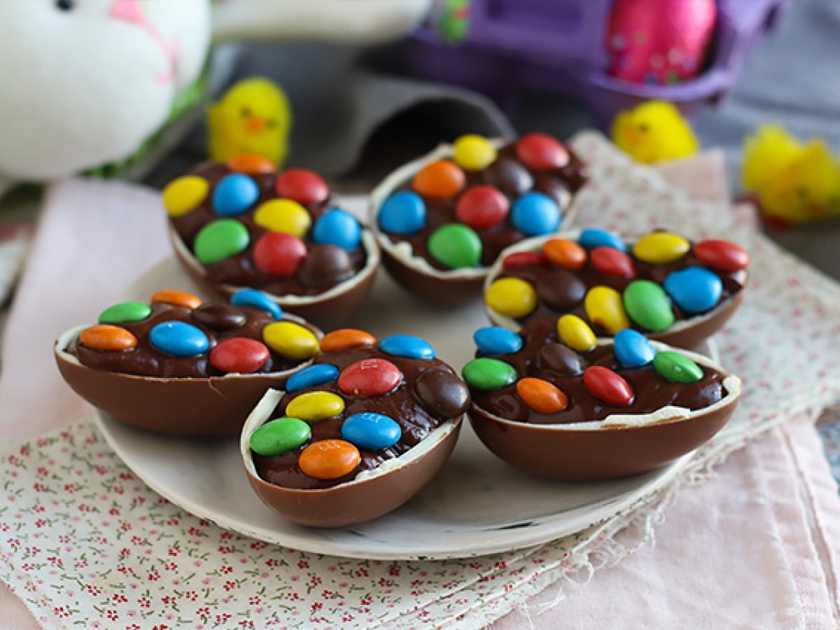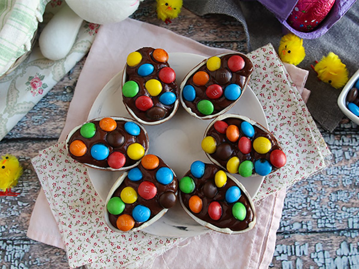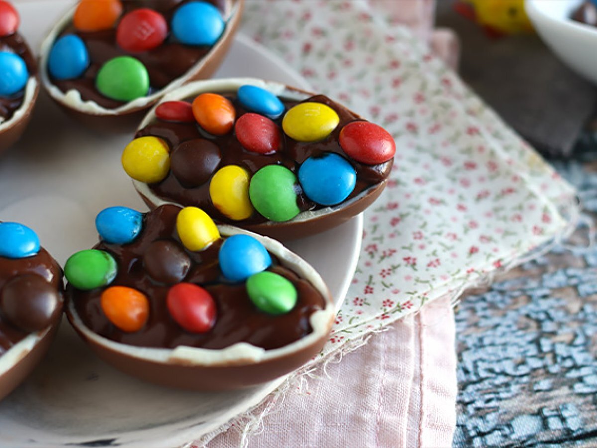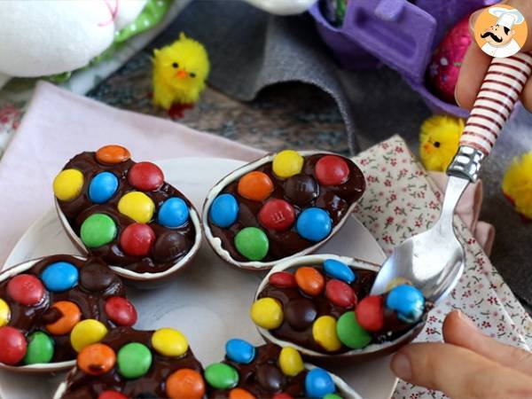 Ostereier gefüllt mit einer schokoladendessertcreme und m&m's