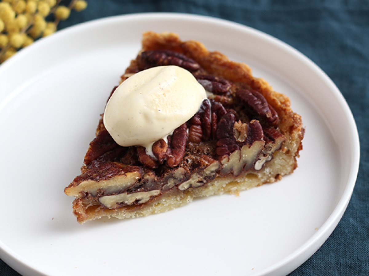 Pekannusskuchen wird traditionell mit einer Kugel Vanilleeis oder Schlagsahne serviert, was die Aromen wunderbar ergänzt und für eine köstliche Kombination sorgt.