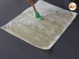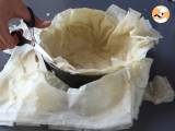 Kleben Sie die Filoblätter paarweise zusammen, bestreichen Sie sie mit geschmolzener Butter und legen Sie sie nach und nach in die Form.