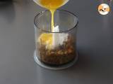 Die Pistazien im Zerkleinerer schnell hacken. Die geschmolzene Butter und den Puderzucker dazugeben und noch einmal schnell verrühren, um alles zu vermischen.