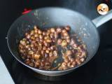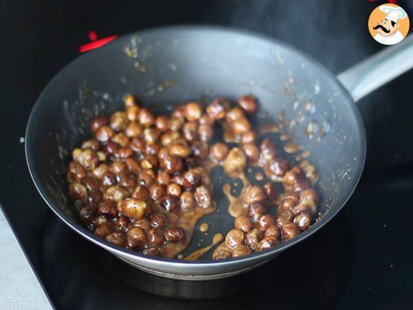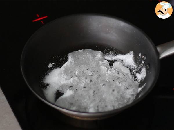 Geben Sie das Wasser und den Zucker in eine Pfanne bei mittlerer Hitze. Wenn die Mischung Blasen wirft, fügen Sie die Haselnüsse hinzu.
