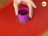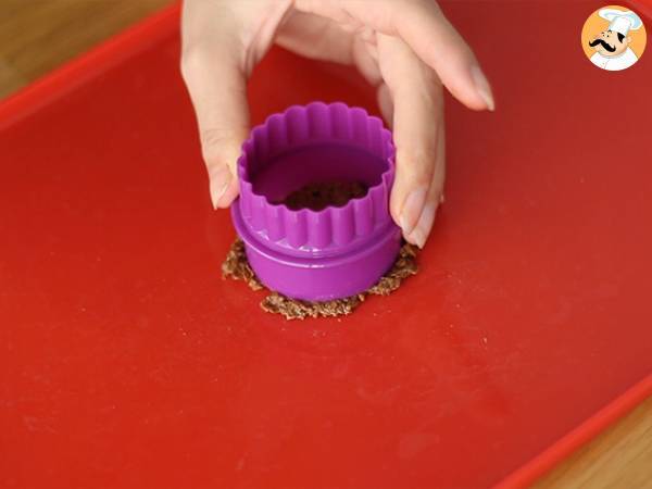 Sofort danach 6 kleine Häufchen dieser Mischung auf Backpapier oder Silikon machen und zu Kreisen mit demselben Durchmesser wie die Halbkugeln ausrollen (verwenden Sie einen Ausstecher, um genauer zu sein). Wenn die Kreise fertig sind, stellen Sie sie bis zur Verwendung kühl.
