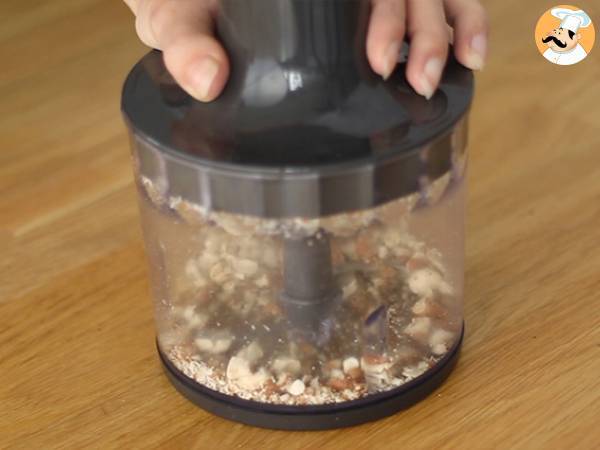 Zerkleinere sie grob mit einem Messer oder im Blitzhacker, wobei du 3 zurückbehältst, die du einfach halbierst.