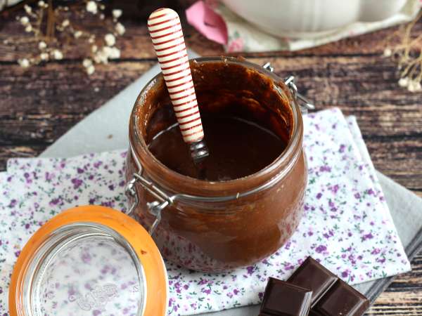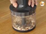 Mit einem Zerkleinerer oder einem Messer die 30 g Haselnüsse grob zerkleinern und mit dem Brotaufstrich vermischen. Stellen Sie sie beiseite.