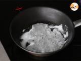 Rühre ständig um, der Zucker wird zuerst um die Haselnüsse herum kristallisieren und dann karamellisieren. Wenn sich der gesamte Zucker in Karamell verwandelt hat, gießen Sie alles auf ein mit Backpapier ausgelegtes Backblech und lassen Sie es abkühlen.