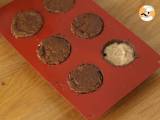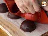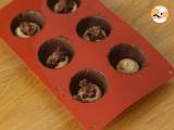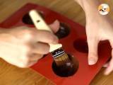 Nehmen Sie Ihre Schokoladenhalbkugeln heraus und füllen Sie sie leicht mit der Pralinenmousse. Dann geben Sie einen Teelöffel des zuvor zubereiteten Haselnussherzens in jede Halbkugel.