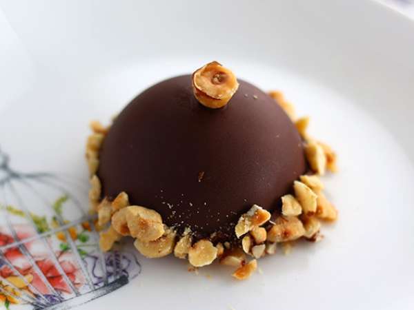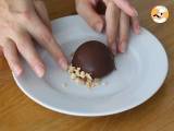 Bedecken Sie das Ganze mit Pralinenschaum, wobei Sie vor dem Rand einen kleinen Abstand von 5 mm lassen. Legen Sie auf jede Halbkugel eine Scheibe Pralinenkrokant und stellen Sie das Ganze für mindestens 3 Stunden kalt.