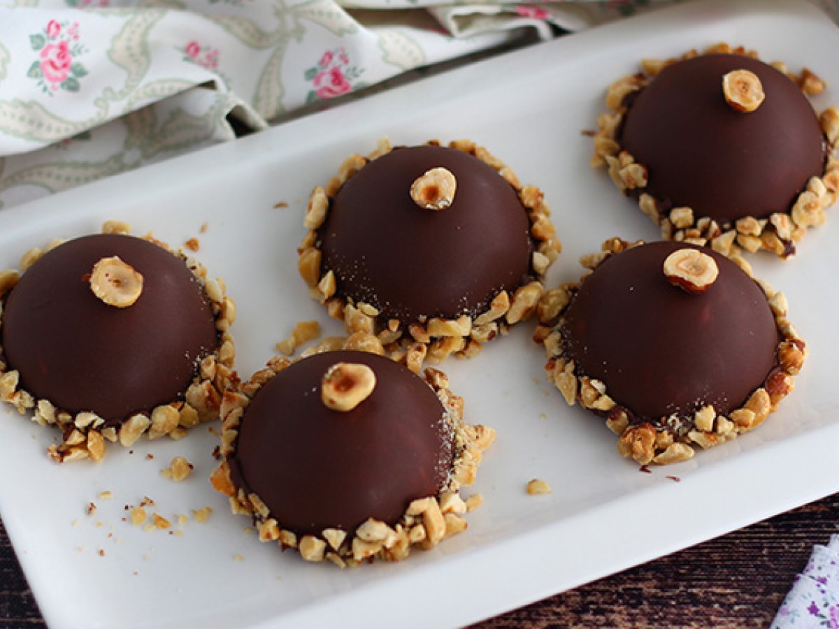 Schmelzen Sie etwas Milchschokolade und verwenden Sie sie, um Haselnüsse rund um die Kuppeln an deren Basis zu kleben. Kleben Sie dann eine halbe Haselnuss auf die Oberseite.