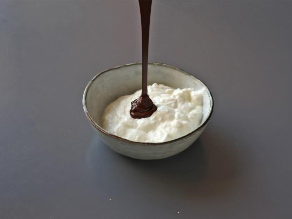 Die Zartbitterschokolade schmelzen (im Wasserbad oder in der Mikrowelle) und zusammen mit dem Joghurt in eine Schüssel geben.