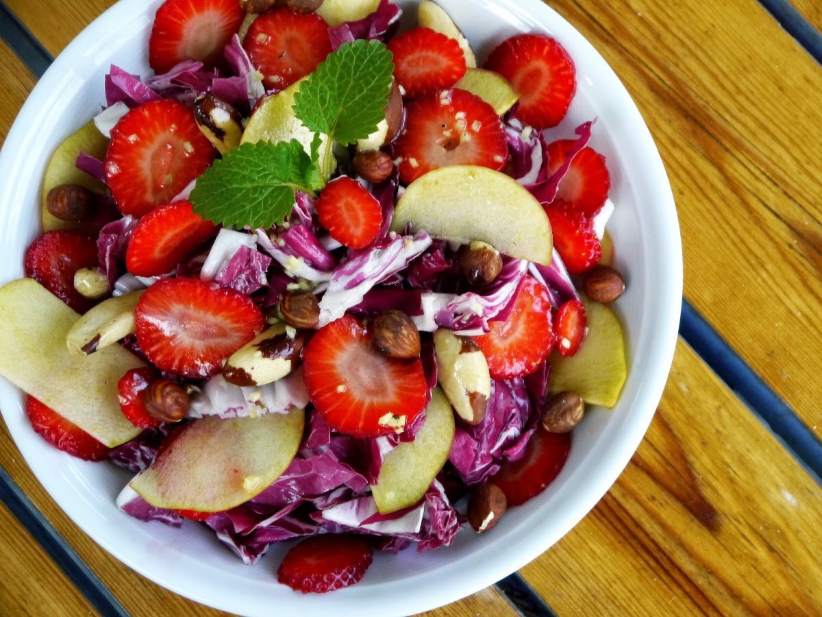 Radicchio-salat mit apfel, erdbeeren, nüssen & walsnuss-ingwer-zitronendressing