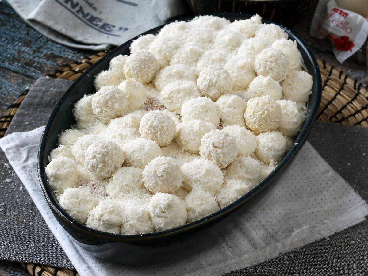 Füllen Sie die Löcher mit Raffaello und bestreuen Sie sie mit Kokosraspeln. Fertig ist das Tiramisu! Sie können das Tiramisu auch mit gerösteten Mandelblättchen dekorieren!